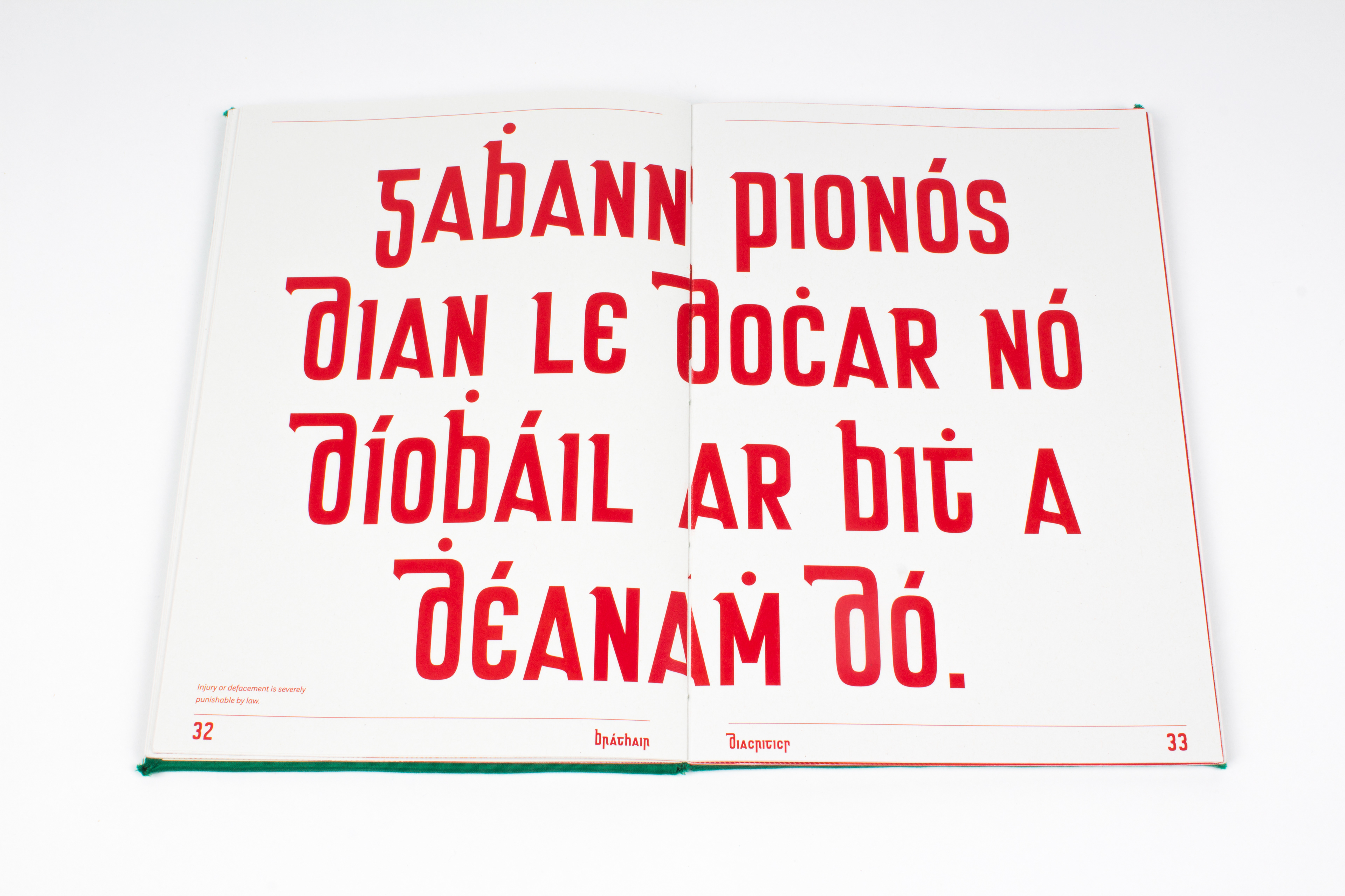 Gaelic type is mostly used for decorative purposes in Ireland nowadays such as on street signs, shop fronts and in cemeteries. However the Irish uncial alphabet originated in medieval manuscripts as an “insular” variant of the Latin alphabet and the first Gaelic typeface was designed in 1571 for a catechism commissioned by Queen Elizabeth to try to convert the Irish Roman Catholic population to Anglicanism. It was used up until the 1960’s when the roman alphabet became the primary alphabet used to print the Irish language.